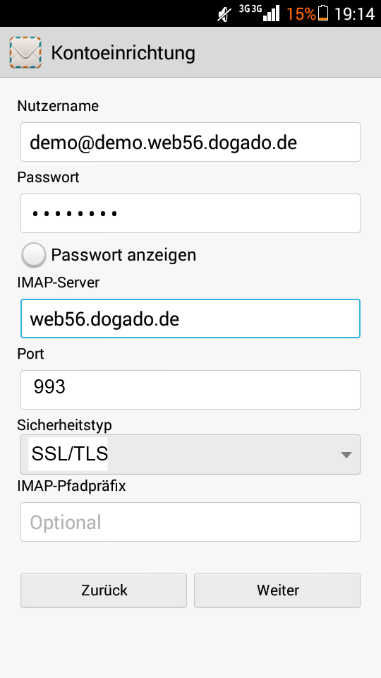 Die ersten beiden Felder sind nun bereits vorausgefüllt. Geben Sie im folgenden darunter den Servernamen ein für „IMAP-Server“ (eingehende E-Mails), in diesem Beispiel „web56.dogado.de“, und drücken auf „Weiter“. Die Angaben sind für den Ein- und Ausgehende E-Mail-Server identisch.