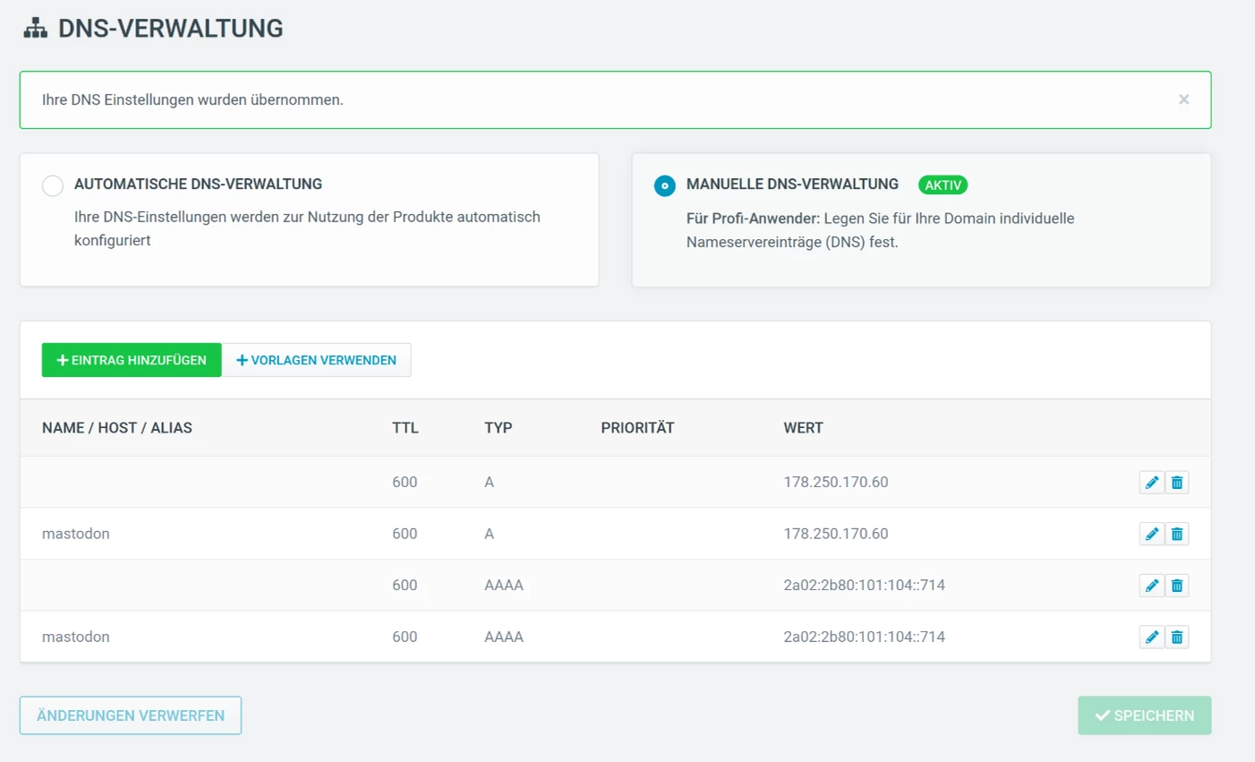 Nun müssen in den DNS-Einstellungen deiner eigenen Domain noch zwei Einträge angelegt werden, die jeweils auf die IPv4-Adresse und die IPv6-Adresse deines Servers verweisen: