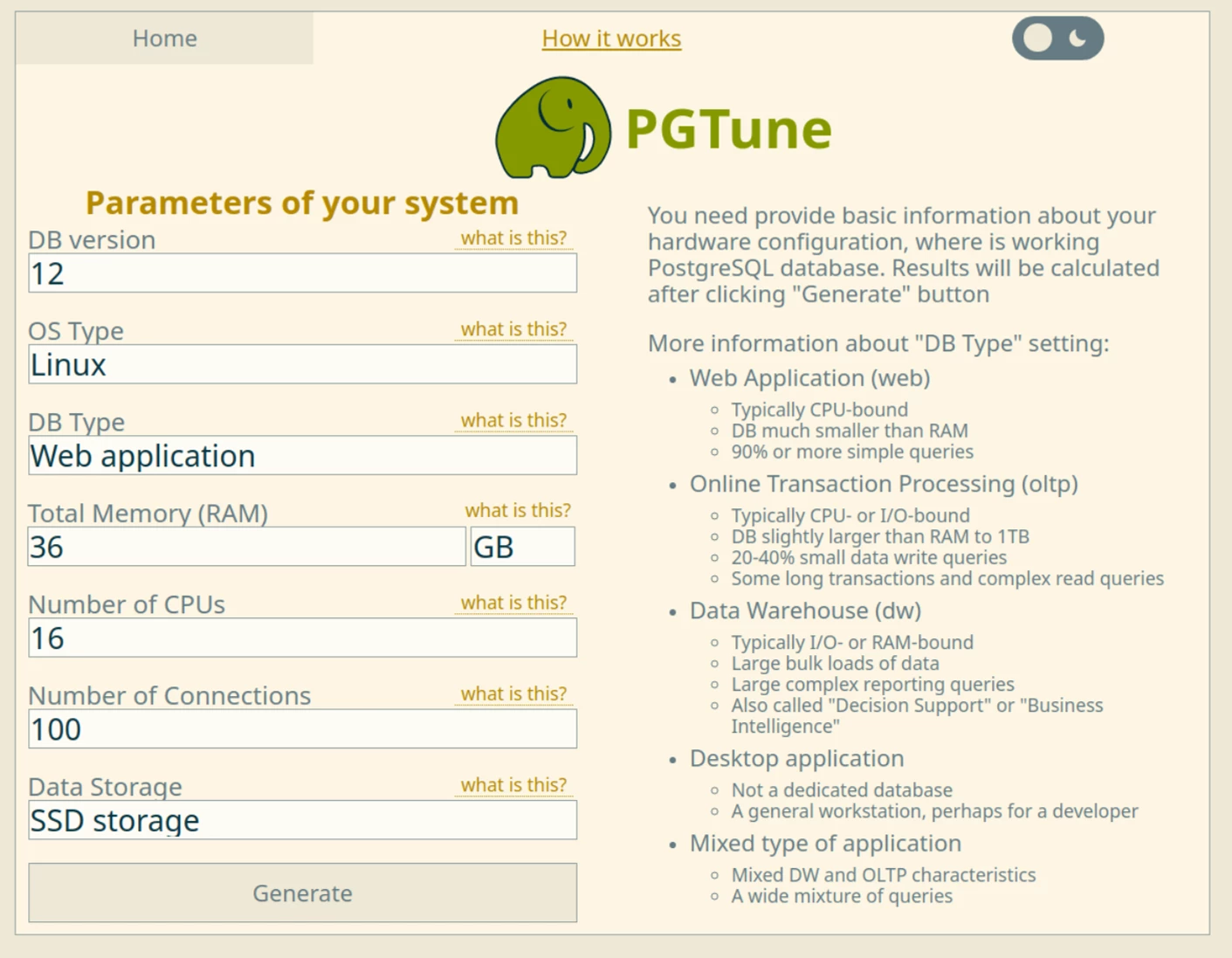 Die Performance der PostgreSQL-Datenbank kann je nach verfügbaren Systemressourcen optimiert werden. Dazu gibt es unter https://pgtune.leopard.in.ua/#/ einen Konfigurationsgenerator, der nach Eingabe verschiedener Systemmerkmale wie Anzahl der CPU-Cores und RAM eine optimierte PostgreSQL-Konfiguration ausgibt.