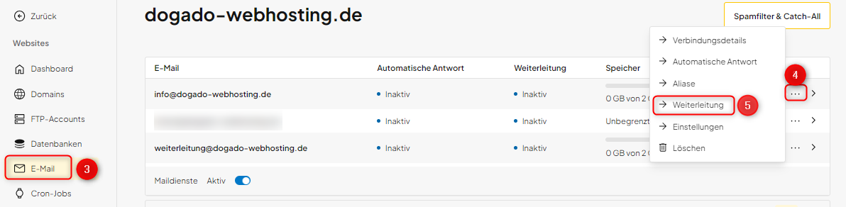 Danach klicken Sie am Ende der Zeile der Mail-Adresse auf die drei Punkte (4) und im Kontextmenü auf "Weiterleitung" (5).