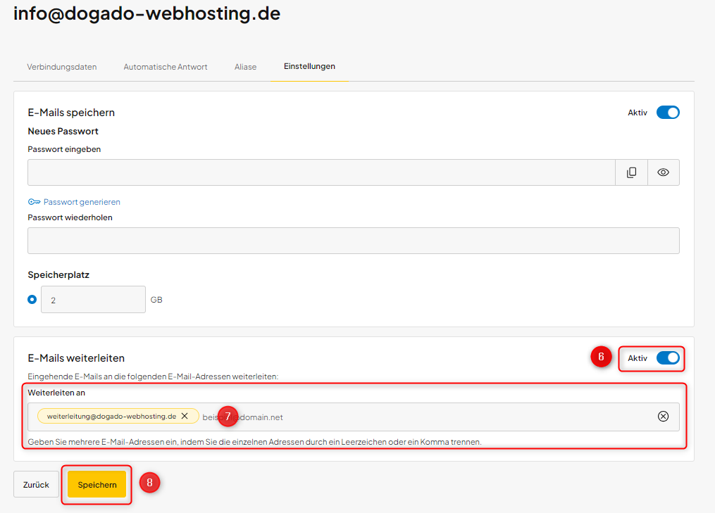 Geben Sie die gewünschte Ziel-E-Mail-Adresse in das Feld "Eingehende E-Mails an die folgenden E-Mail-Adressen weiterleiten" (8) ein, bestätigen Sie die Eingabe mit Enter und klicken Sie anschließend auf "Speichern" (9), um die Änderungen zu speichern.