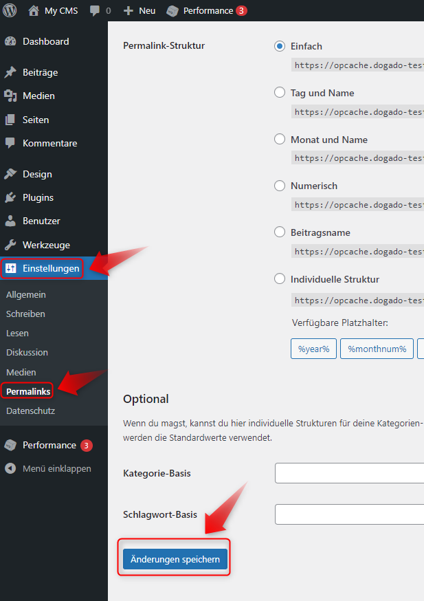 - Klicken Sie auf Einstellungen > Permalinks im Menü links.