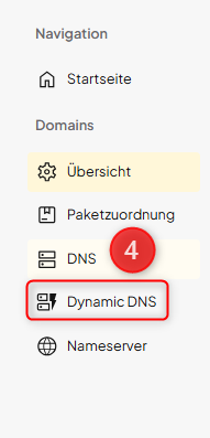 Klicken Sie in der Nameserver-Verwaltung im Menü links auf den Punkt "Dynamic DNS“ (4), um in die Verwaltung für DynDNS zu wechseln.