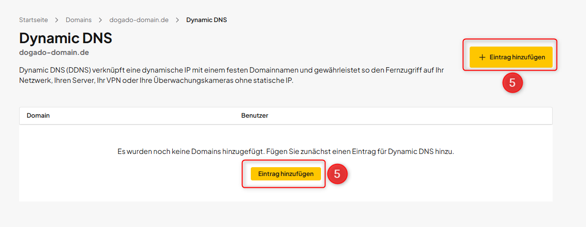 Klicken Sie oben auf den Punkt "Eintrag hinzufügen“ (5), um in den DynDNS-Dialog zu Ihrer Domain zu gelangen.