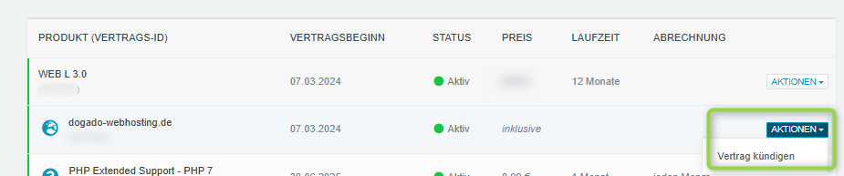 Neben dem Vertrag finden Sie unter „Aktionen“ die Punkt „Vertrag kündigen“