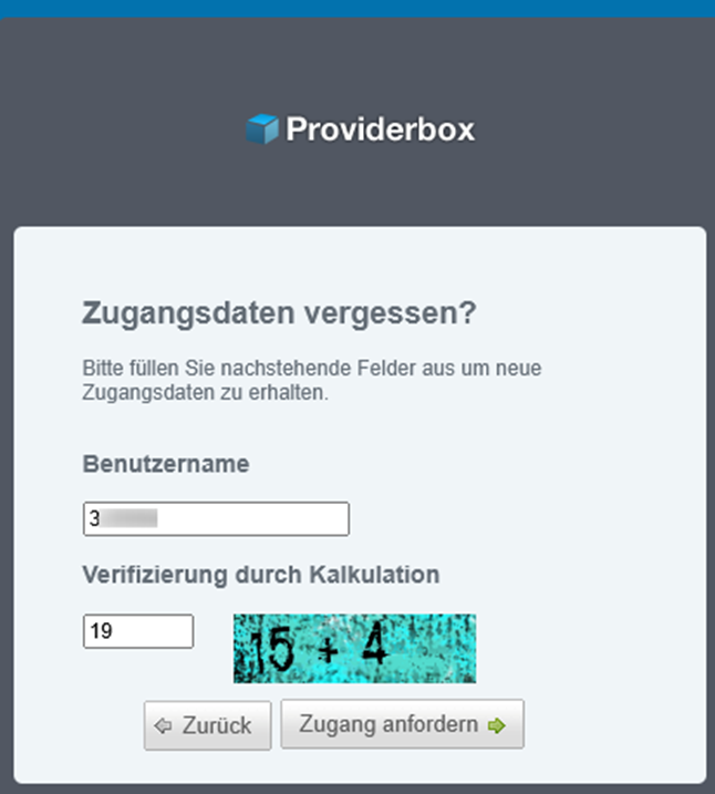 - Bitte loggen Sie sich unter https://www.providerbox.com mit Ihrer Kundennummer als Benutzernamen ein. Sollten Sie das Passwort nicht zur Hand haben, so könnten Sie dieses unter https://www.providerbox.com/password_forgot.php durch Eingabe des Benutzernamen und einer Lösung des Rechenbeispiels zurücksetzen: